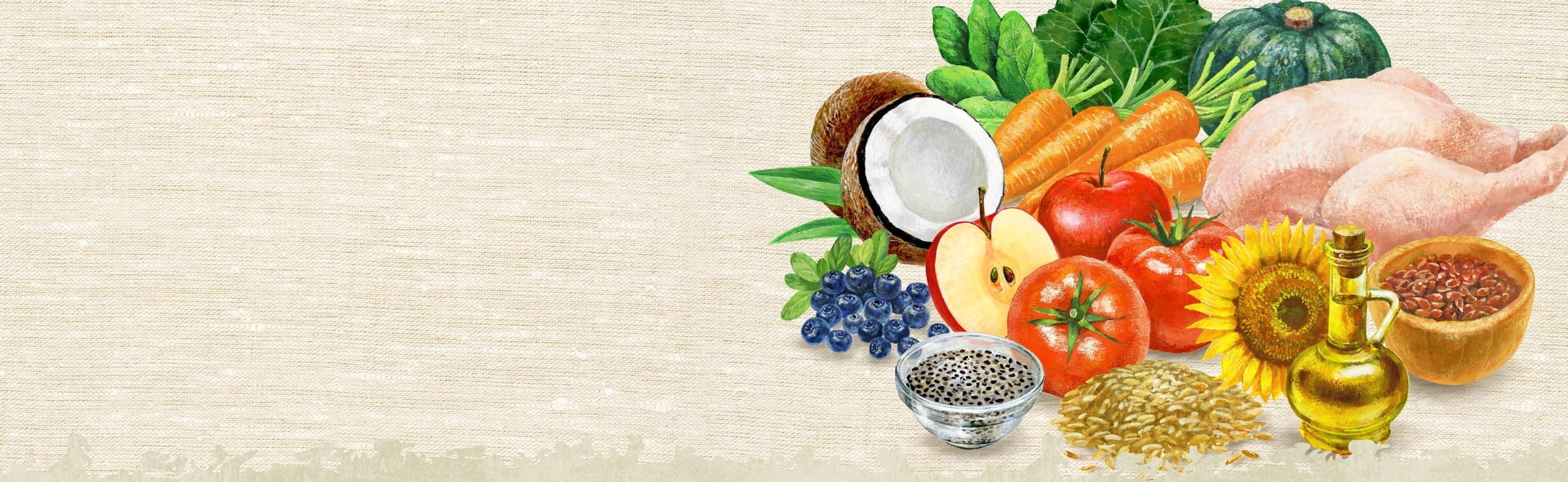 チキン(肉)、チキンミール、大麦*2、オーツ麦*2、玄米*3、鶏脂*1*4、ポテトタンパク、ビートパルプ、タンパク加水分解物、ラムミール*5、サーモンミール*6、モロコシ*7、亜麻仁*7*8、エンドウタンパク、フィッシュオイル*1、ココナッツ*9、チアシード*2*7*8、乾燥卵、トマト*7、ケール*7、パンプキン*7、ホウレン草*7*10、ブルーベリー*7、リンゴ*7、ニンジン*7、ビタミン類(A、B1、B2、B6、B12、C、D3、E、コリン、ナイアシン、パントテン酸、ビオチン、葉酸)、ミネラル類(カリウム、クロライド、セレン、ナトリウム、マンガン、ヨウ素、亜鉛、鉄、銅)、アミノ酸類(メチオニン)、酸化防止剤(ミックストコフェロール、ローズマリー抽出物、クエン酸)